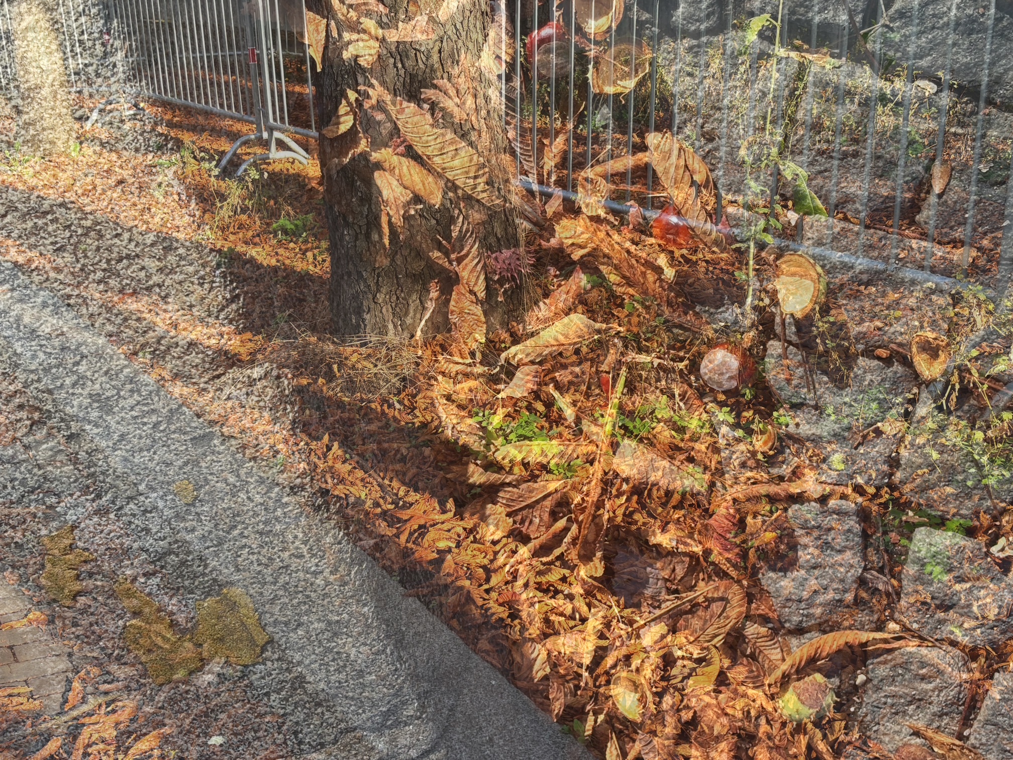Le roulement des marrons marron glacé sur les pavés luisants de pluie